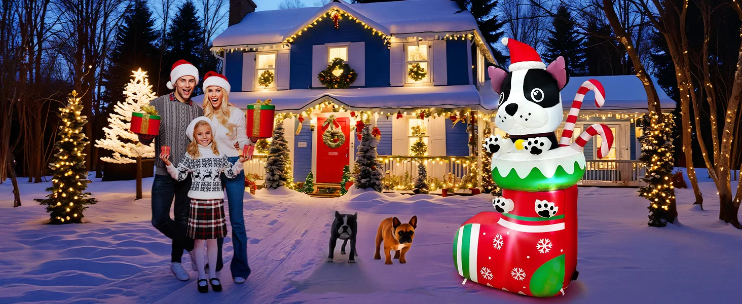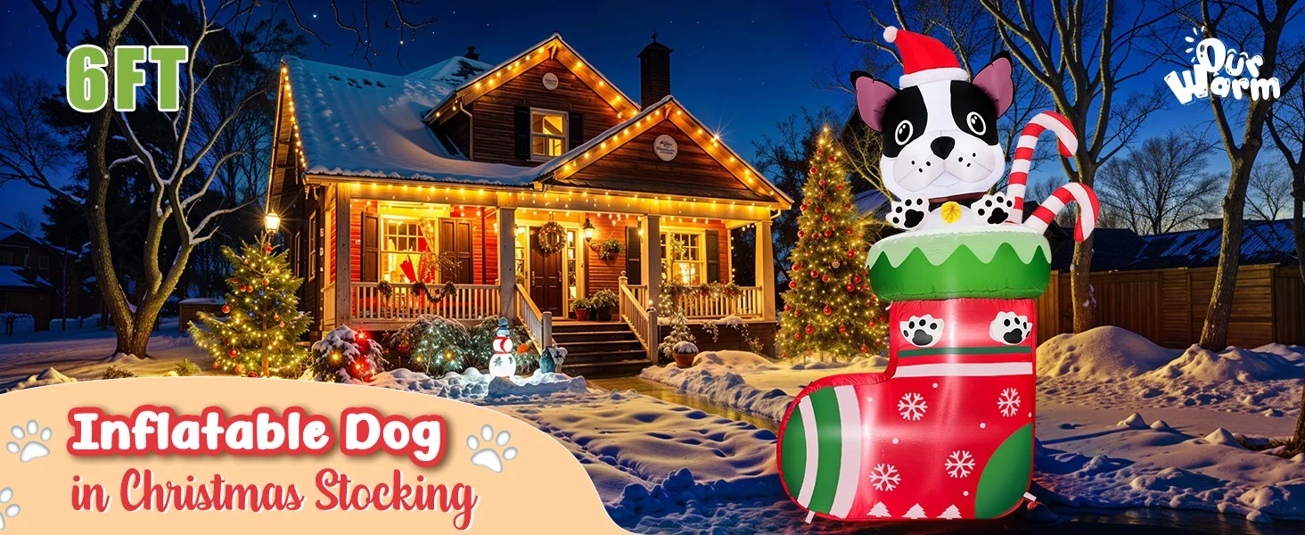 6FT Christmas Inflatable Dog in Stocking – Light-Up Blow Up Yard Decoration for Holiday Parties & Gardens