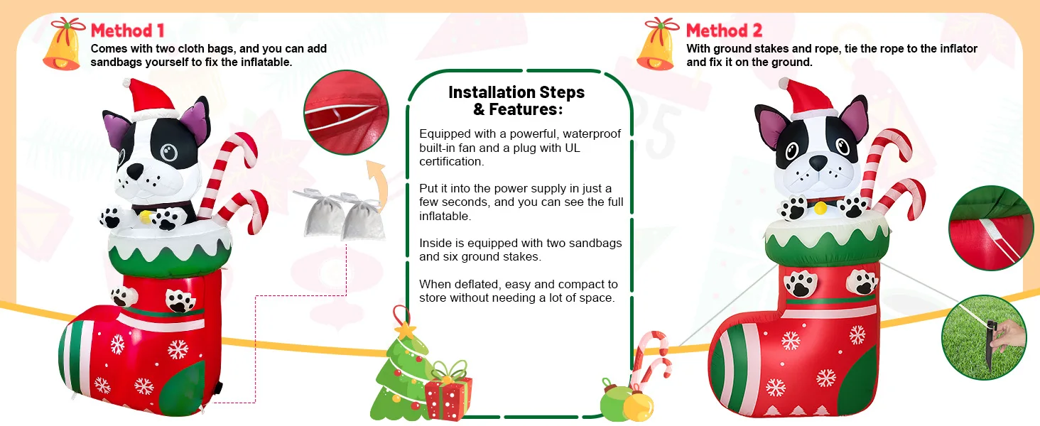 Glowing Holiday Ambience: Equipped with 4 built-in LED lights, this Christmas dog inflatable lights up beautifully at night. Whether on the front lawn, by the porch, or in the garden, the Christmas blowups create a festive atmosphere and become the star of your Christmas outdoor decorations