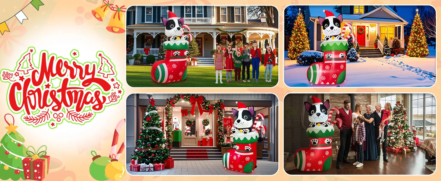 Festive Inflatable Dog in Stocking: This 6 FT Christmas inflatable outdoor decoration features a cheerful black and white bulldog sitting in a red stocking adorned with classic snowflakes. The playful candy cane on its back and happy expression add a joyful and whimsical touch to your yard, spreading holiday spirit with charm